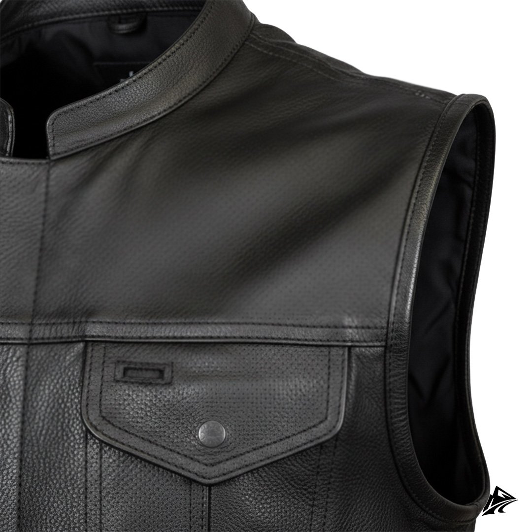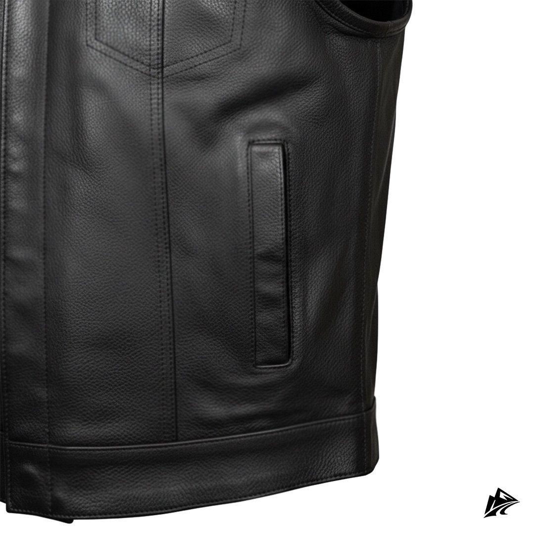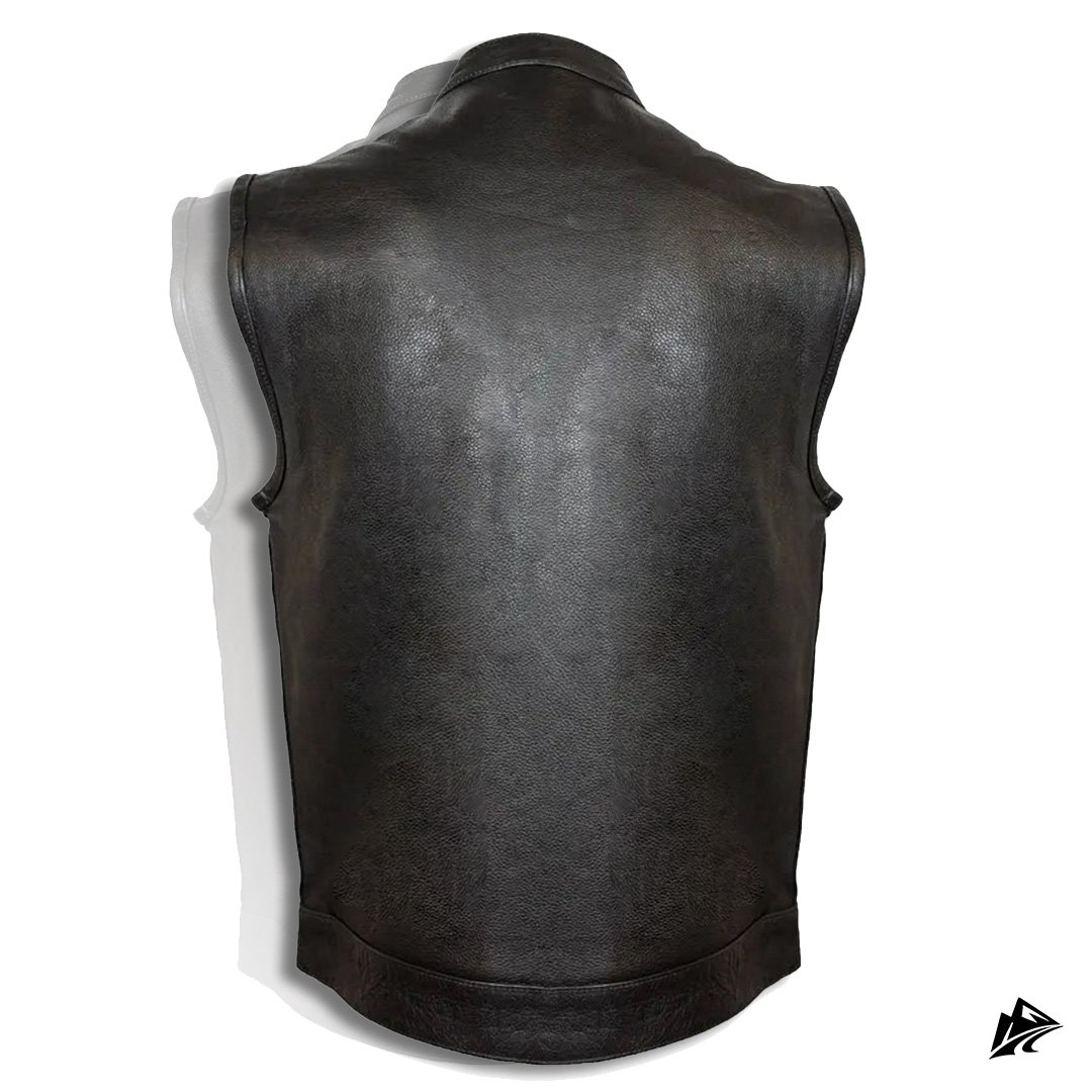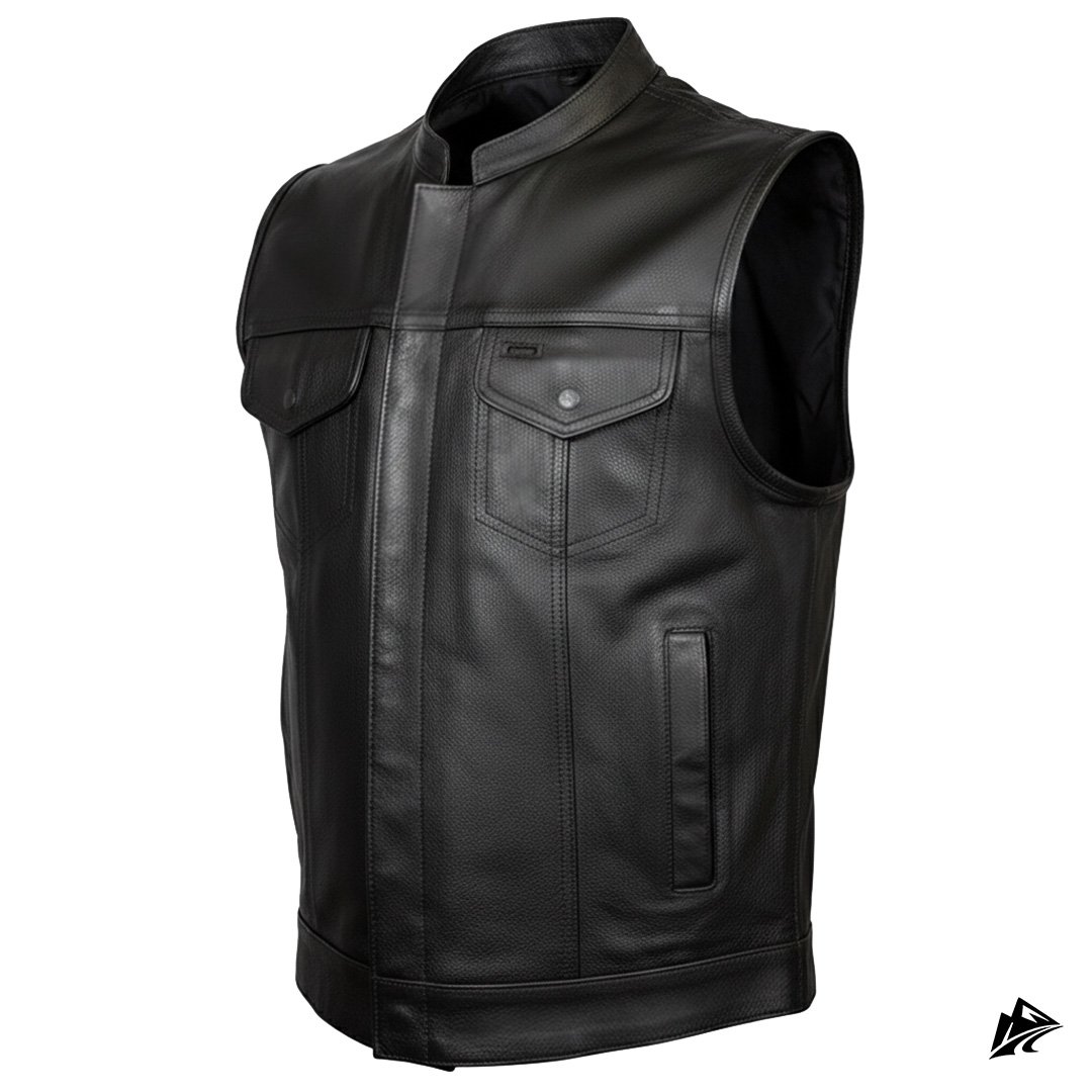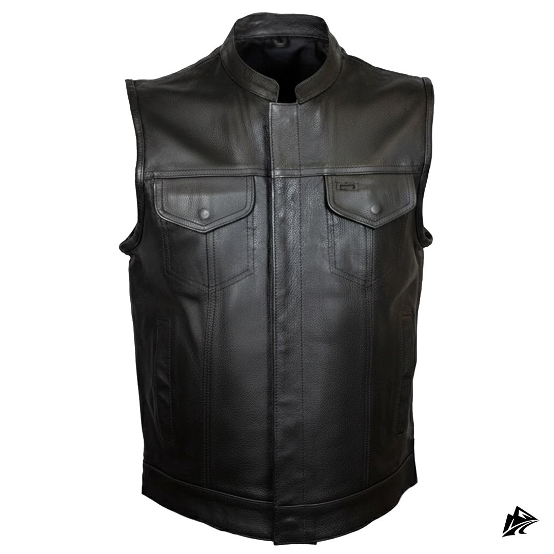 This men’s black leather motorcycle vest is built around a clean “club style” profile—minimal, sharp, and easy to layer. From the images, it features a stand/band collar for a structured neckline, two flap chest pockets for secure storage, and a plain back panel that keeps the look smooth and uncluttered. It’s designed for riders who want a tough outer layer that looks right on the bike and still works off the bike.